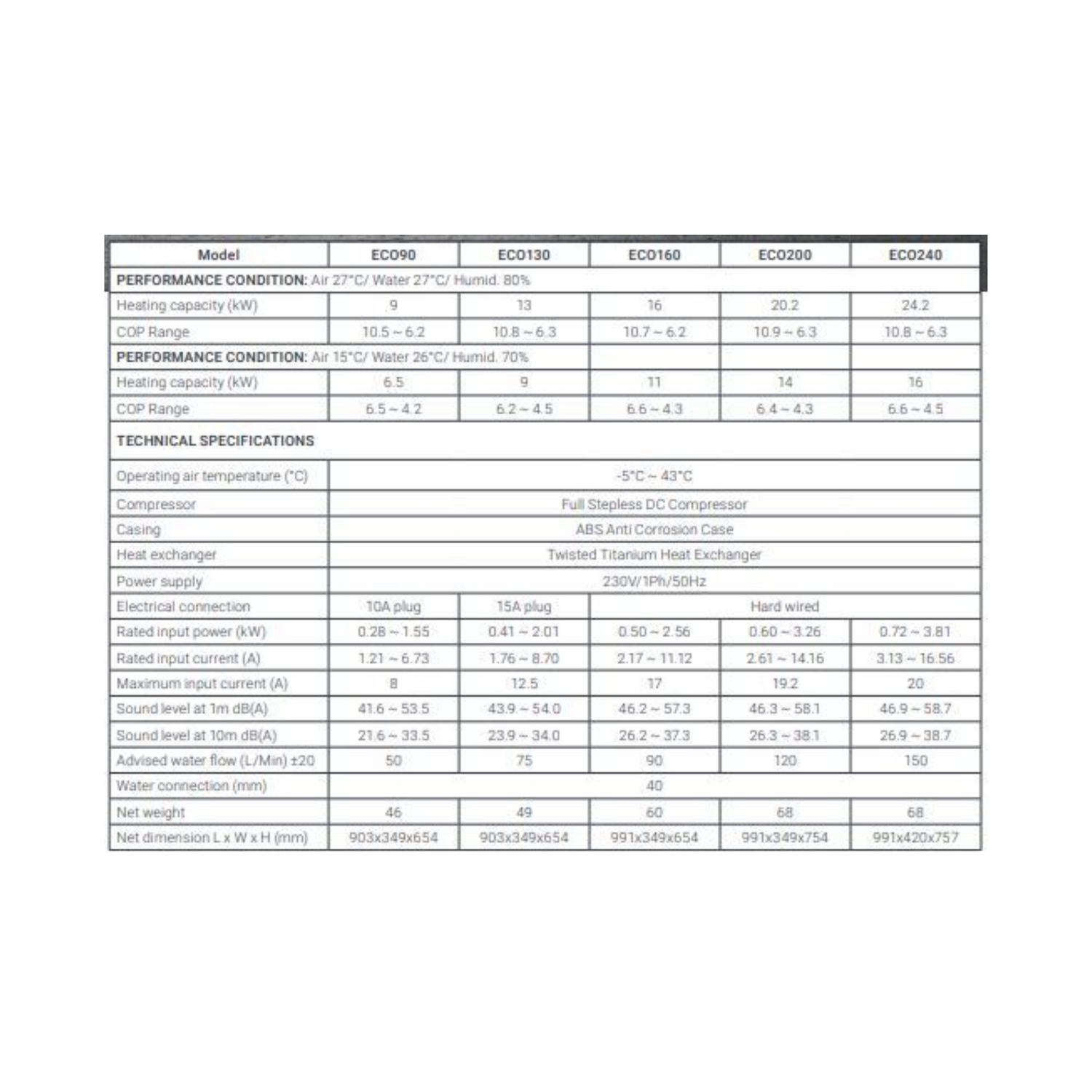 - Efficient Energy Use: With a COP range of 10.8 to 6.3 at optimal conditions, the Eco 130 provides exceptional energy efficiency, delivering more heat with less electricity.
