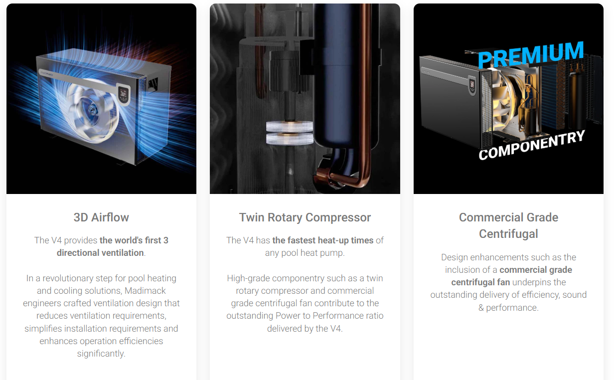 The Madimack InverELITE V4 270 27kW is a state-of-the-art pool heat pump designed to deliver unparalleled efficiency and whisper-quiet operation. Engineered with advanced technology and premium components, it ensures your pool remains at the perfect temperature year-round.